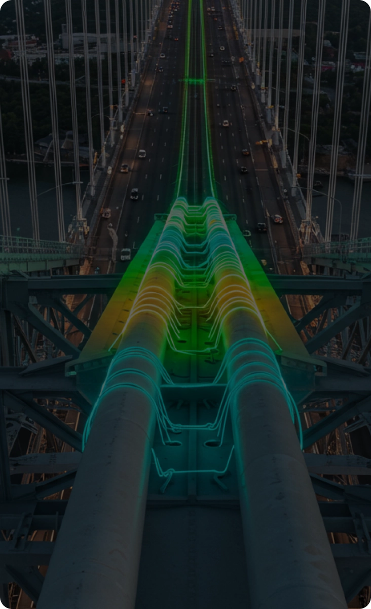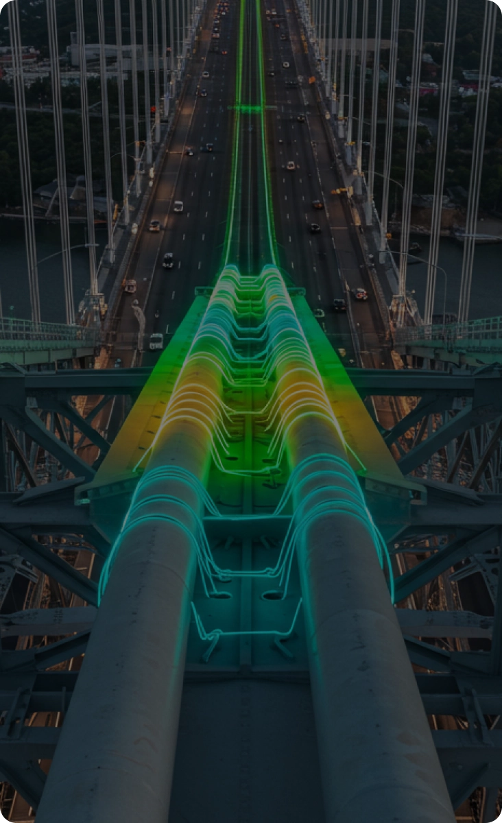 Inspection橋梁ケーブルや鋼構造物の微細な振動を、ラインベースのヒートマップでリアルタイム可視化。従来は数百台のセンサーを要した広域監視を、数台のシステムで実現します。